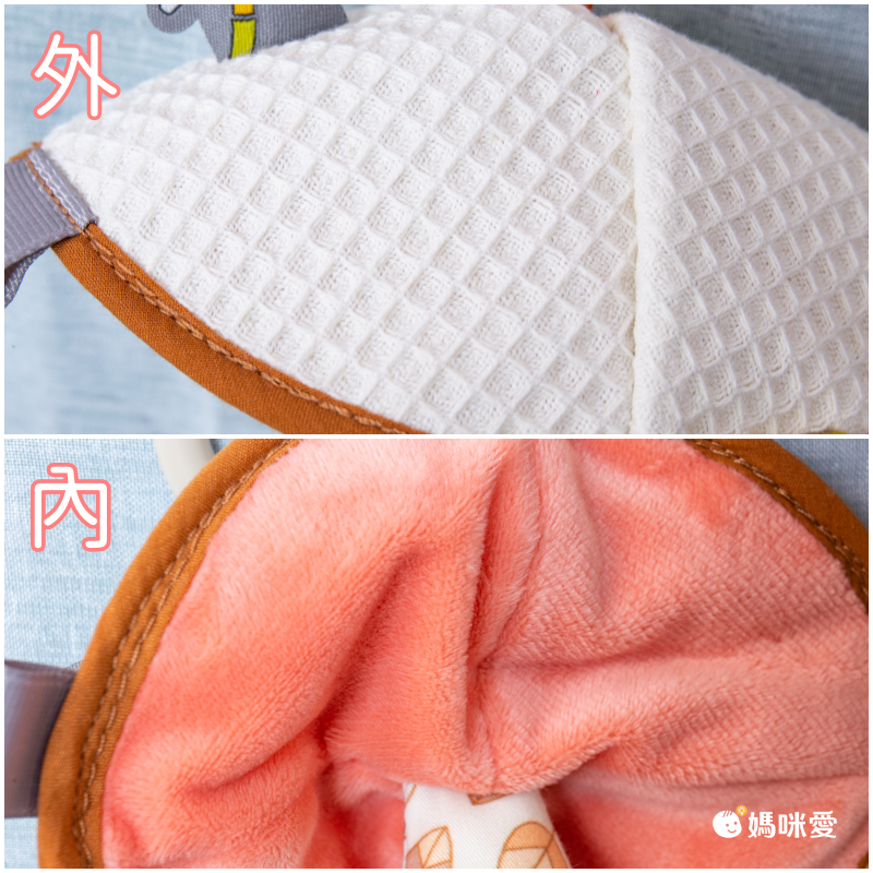 蘑菇的內外是不同材質的布料,寶寶可以一手同時觸摸,感受不一樣觸感