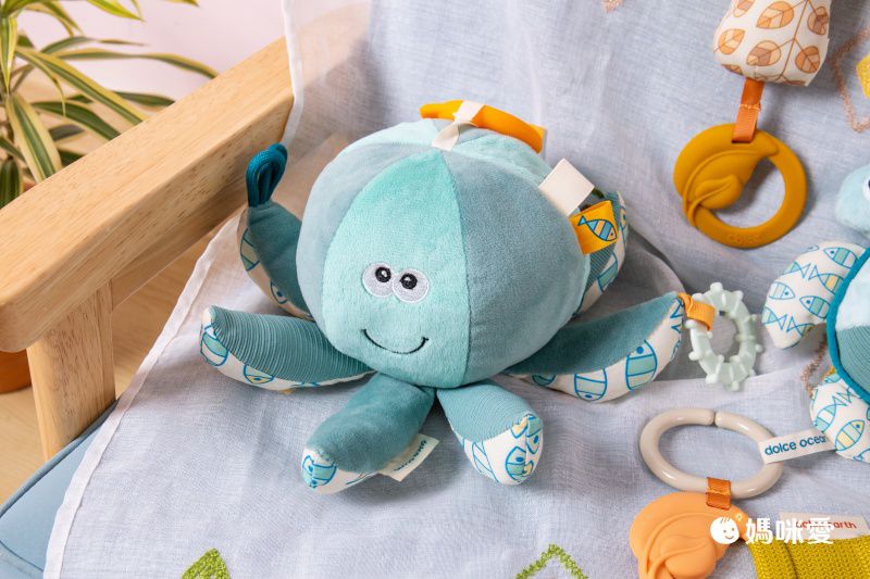除了內有搖鈴外,章魚的身上也有許多觸感布標,寶寶可以盡情探索不同觸感,可以刺激寶寶的觸覺感受喔~章魚的腳雙面是不同的紋路材質,有一面是可愛的小魚圖案,也可以幫助寶寶認識顏色和圖形
