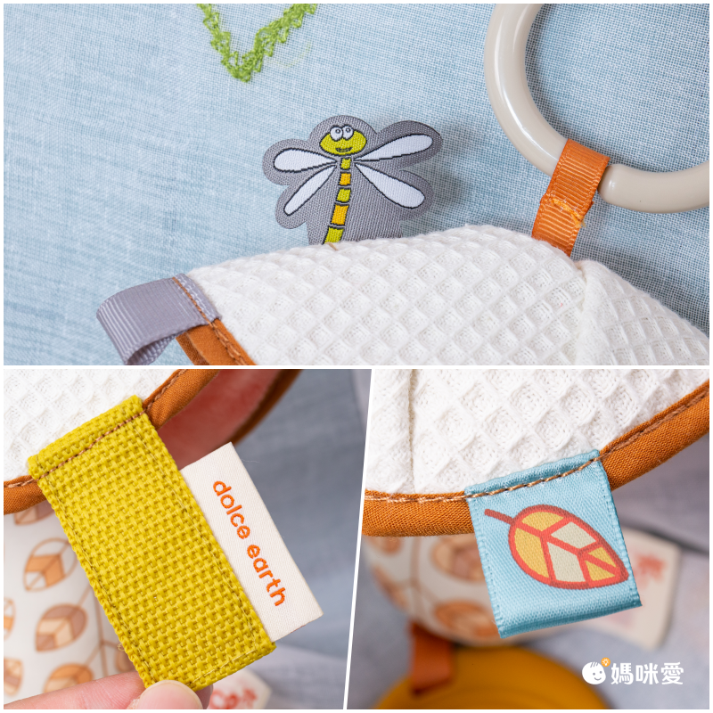 蘑菇上有一隻小蜻蜓、小樹葉、黃色標籤的布標,寶寶可以探索不同紋路材質和認識圖案
