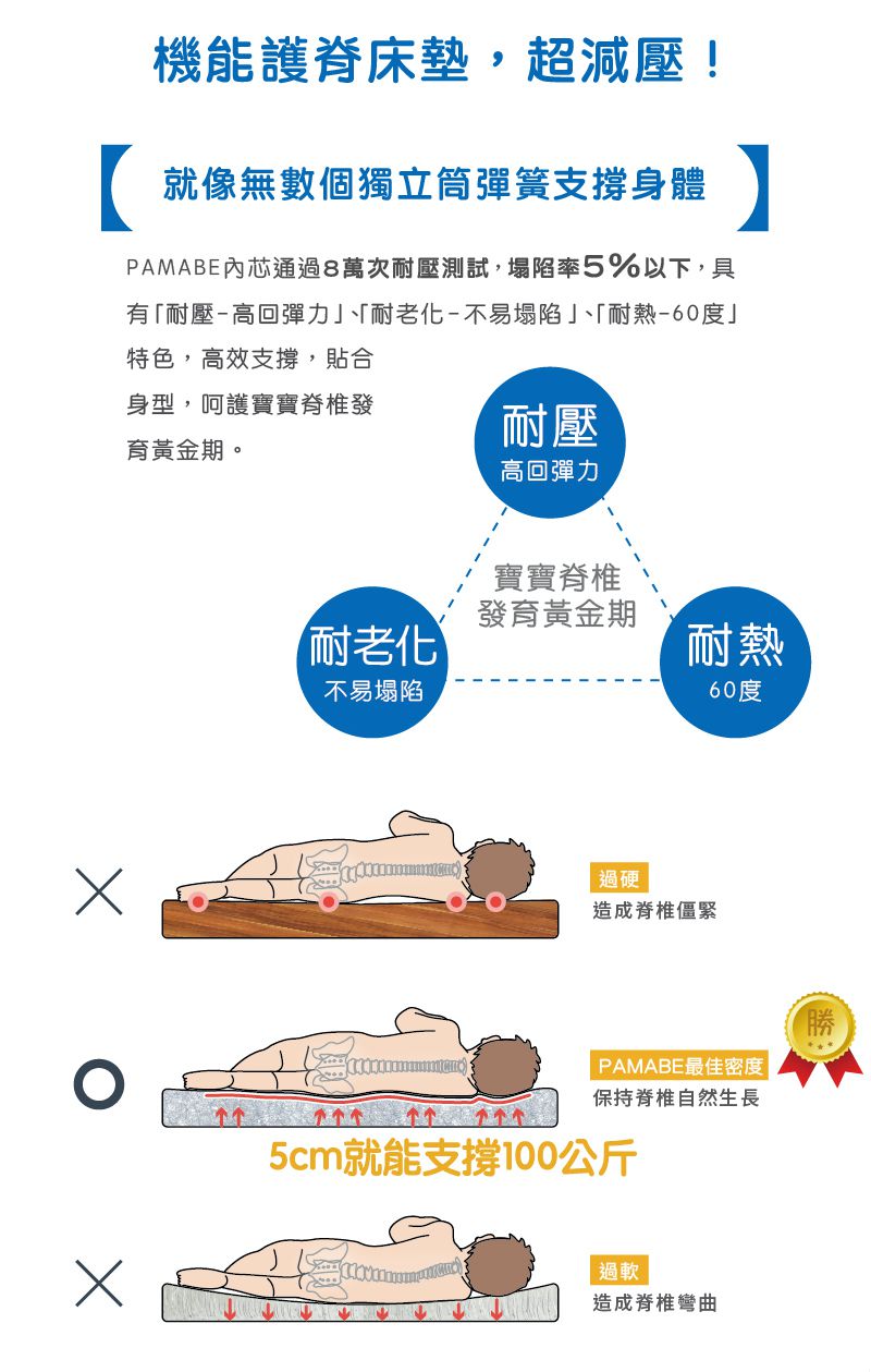 經過多次臨床實驗,PAMABE 5cm厚度的內芯有高回彈力、久睡不易坍塌的特性,幫助寶寶用正確的方式躺臥,讓成長中的脊椎自然伸展。