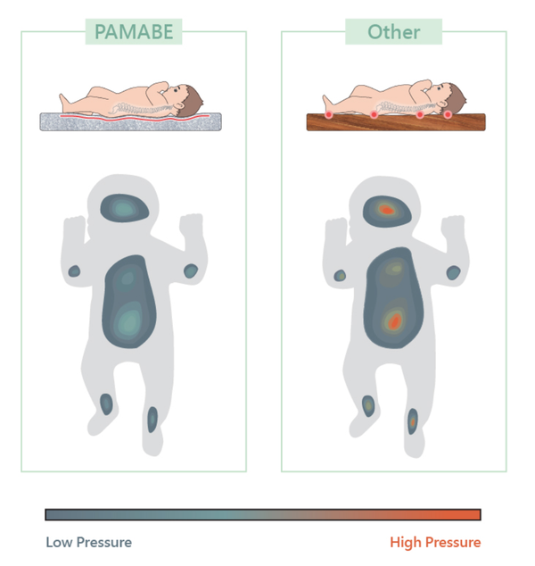 PAMABE 能平均分散身體壓力,讓肌肉放鬆、減少翻身次數,讓寶寶睡得更好!下圖中橘紅色的地方代表身體承受的壓力越大