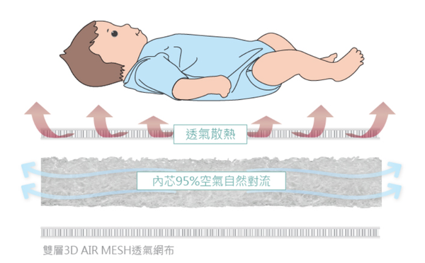 PAMABE的透氣性比傳統的泡棉高出3倍以上,內芯95%充滿空氣,使用上更安全!由於新生兒體溫調節力較差,所以選擇能快速散熱的床墊很重要唷!
