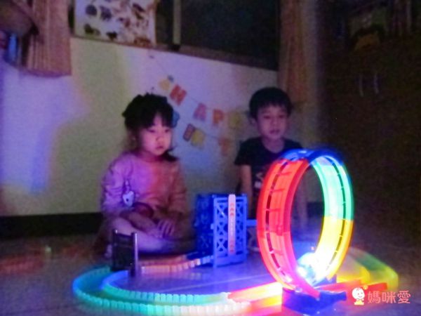 雖說是發亮車車,但是燈光不會刺眼,讓我很放心。孩子們第一次看見會發光的軌道車,真的玩的超嗨~捨不得睡覺啦XD