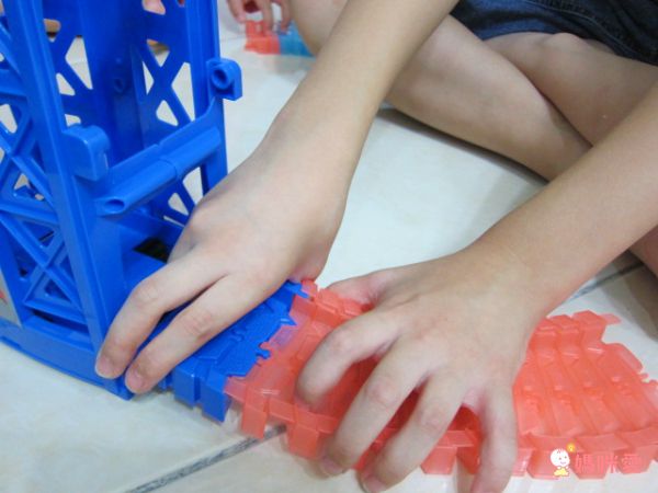 小小賽車衝阿!兩兄妹認真拼~努力拼,把其他款的軌道通通拿來拼~變換出超多路線。跑一跑還會故意用手撐起軌道,但電動車絲毫不受阻礙,碰到拱起的小手山丘一樣跑得很順喔!