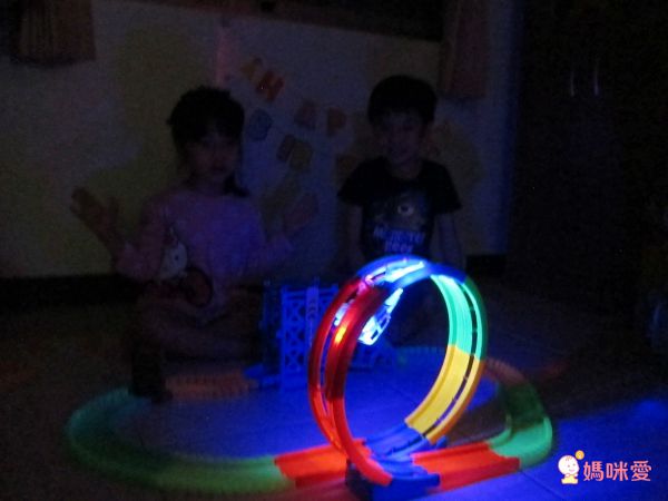 組好後馬上想玩夜光軌道!哈,當然要關燈啦~~從沒玩過一個玩具要指名關燈的XD