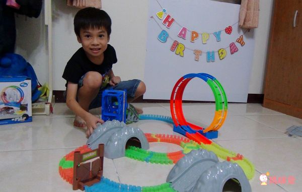 最後把所有夜光軌道通通組合在一起吧!不設限的玩法,可以讓孩子自己創造自己的樂園,玩都玩不膩,而且看著 LED 燈電動車一閃一閃過山洞、爬 360 度軌道,孩子更活得滿滿的成就感啊!大推家有車車迷的媽咪一定要入手唷ヾ(●゜▽゜●)♡