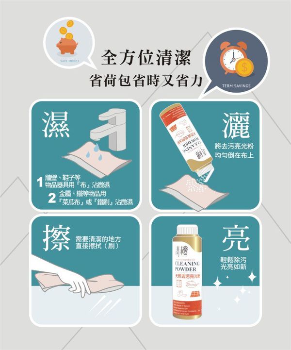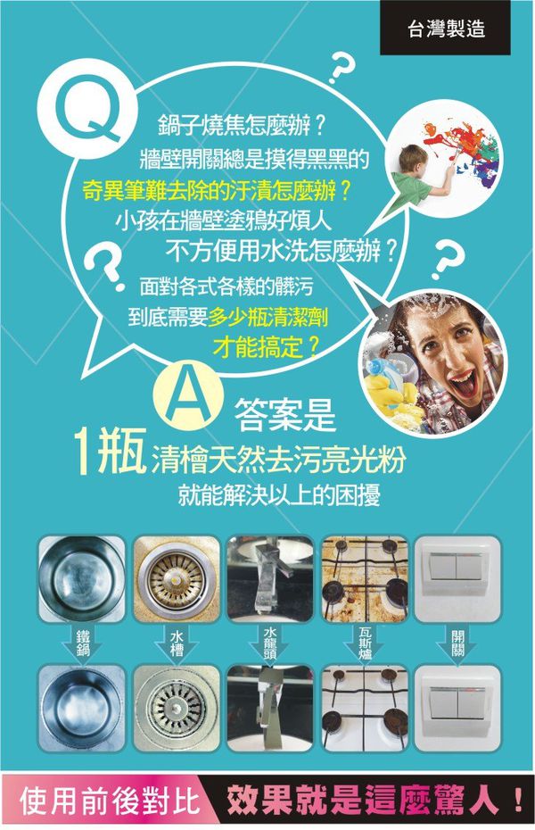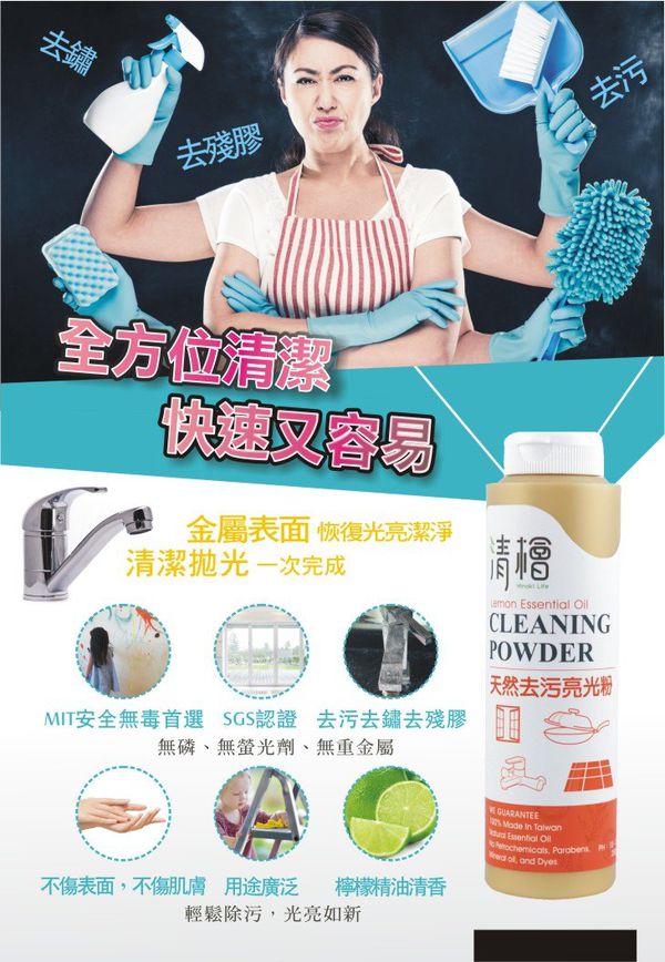 用途:舉凡不鏽鋼板、鐵等金屬材質,如瓦斯爐、排油煙機、鍋具、水龍頭、白鐵門、門窗、鐵鏽等。油垢、污垢、殘膠、家具、浴室、地板、樓梯、扶手、鞋子...等物品,不方便用水洗的,就用清檜天然去污亮光粉!