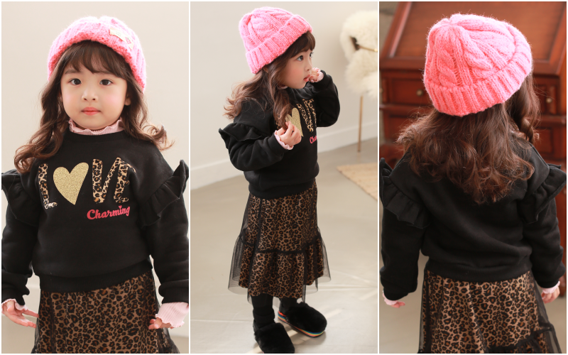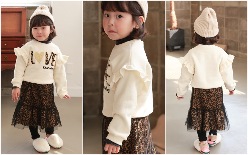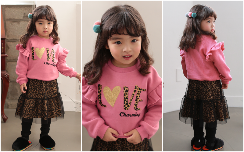 韓國 Dalla - (裏起毛)虎紋字體荷葉袖T-玫瑰粉