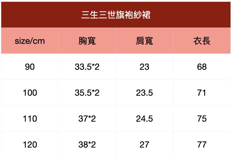 附上尺寸表給媽咪們參考~三生三世旗袍紗裙