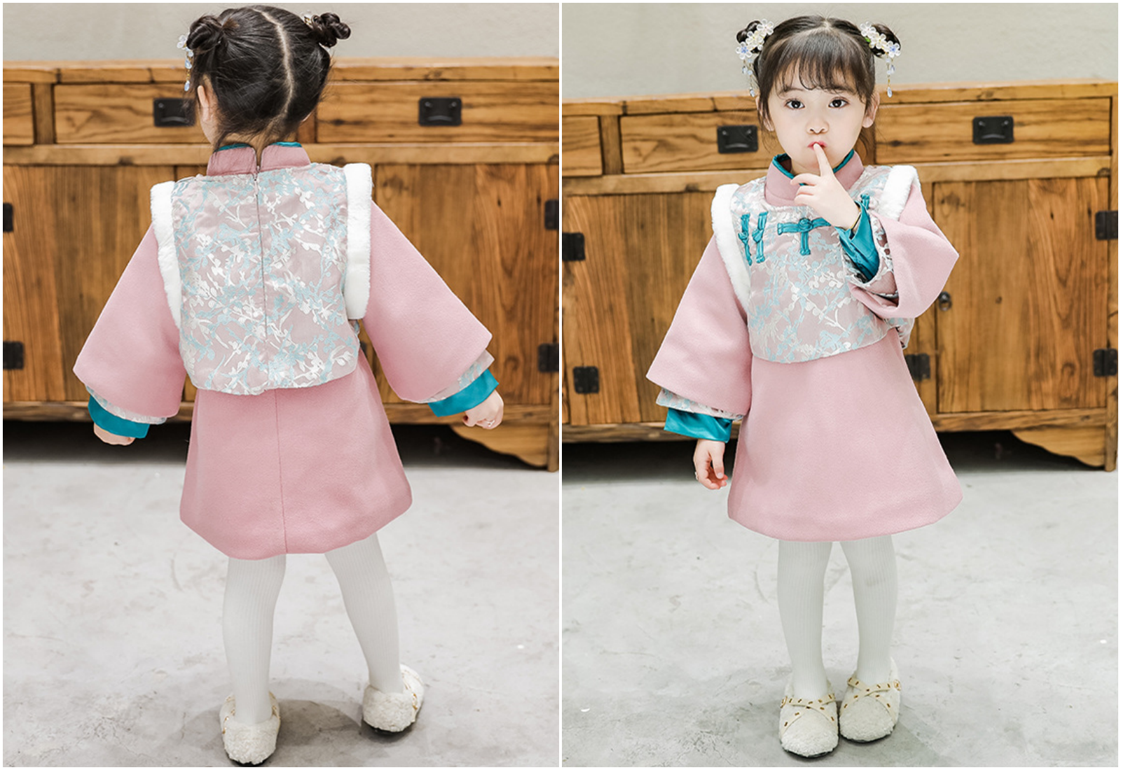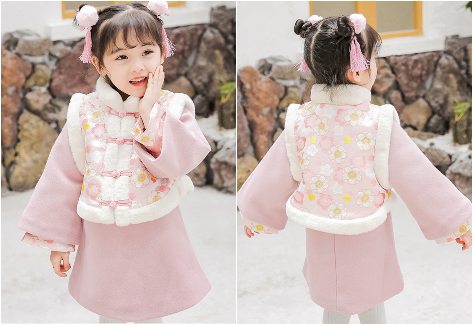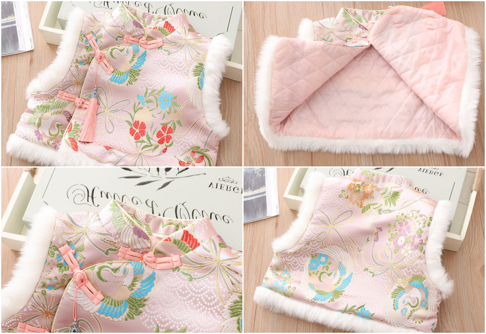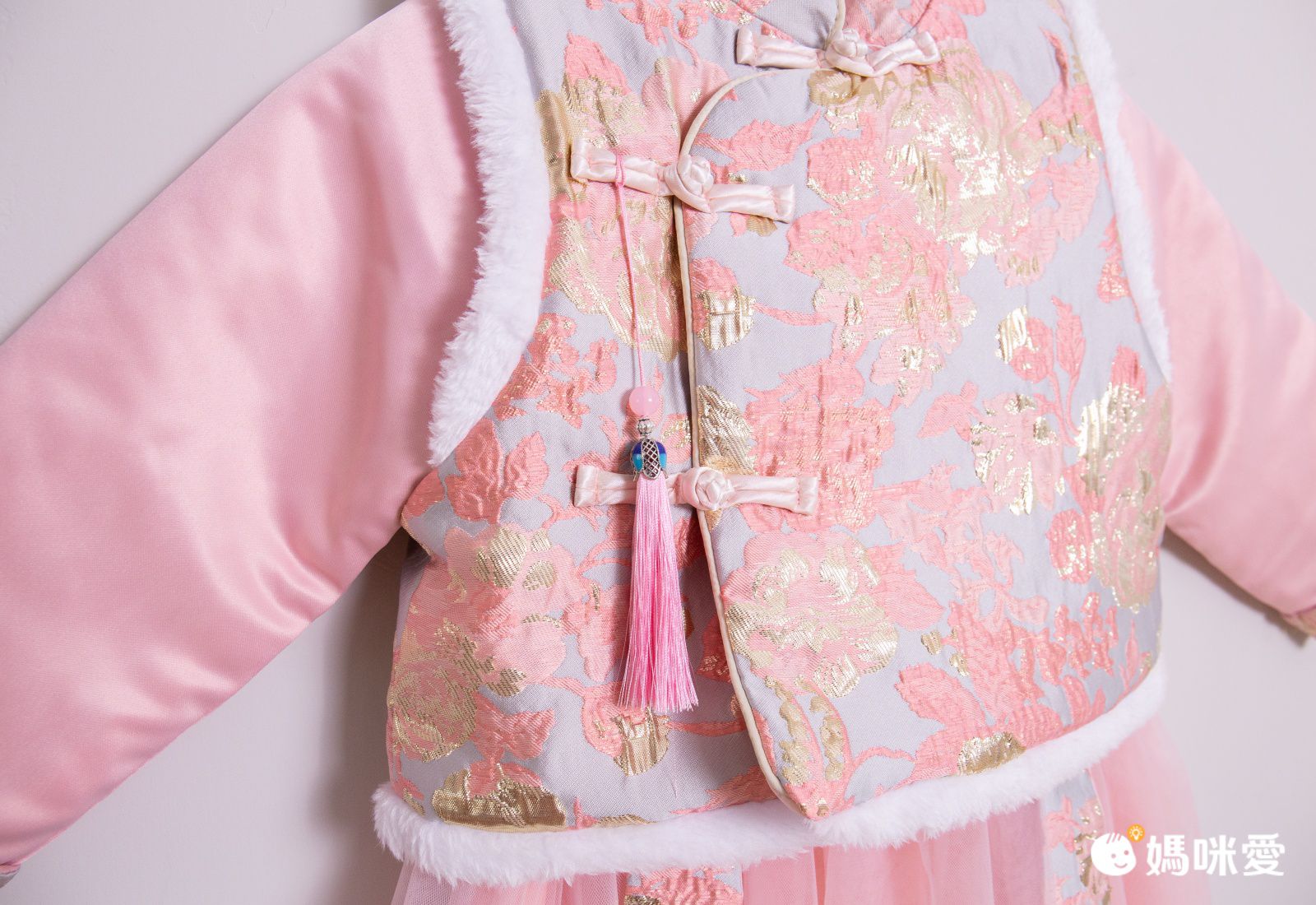 看看這背心的緹花超精緻!白色毛絨拼接點綴,中國風十足,加上加厚的洋裝,寒流也不怕