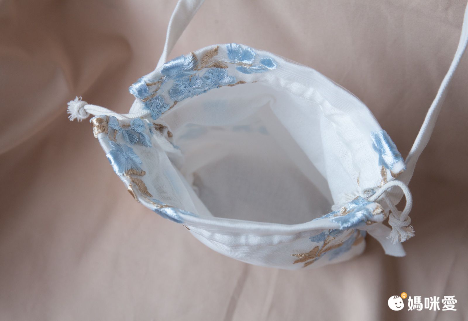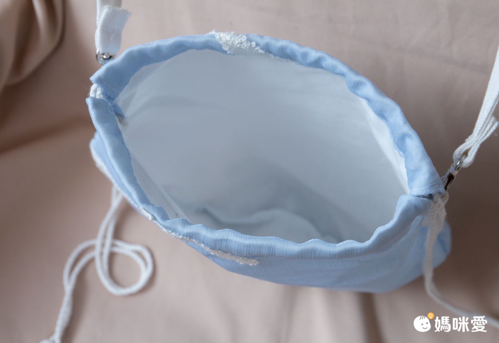 上方束口設計,棉繩可自行打結,可拆式的背帶,平常放在大包裡當化妝包也很適合