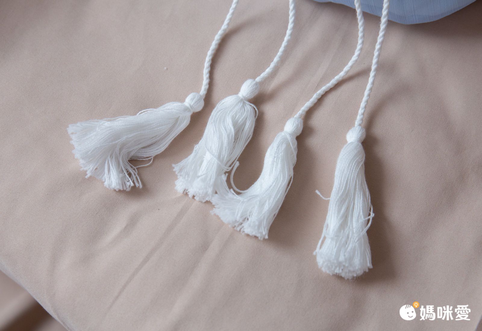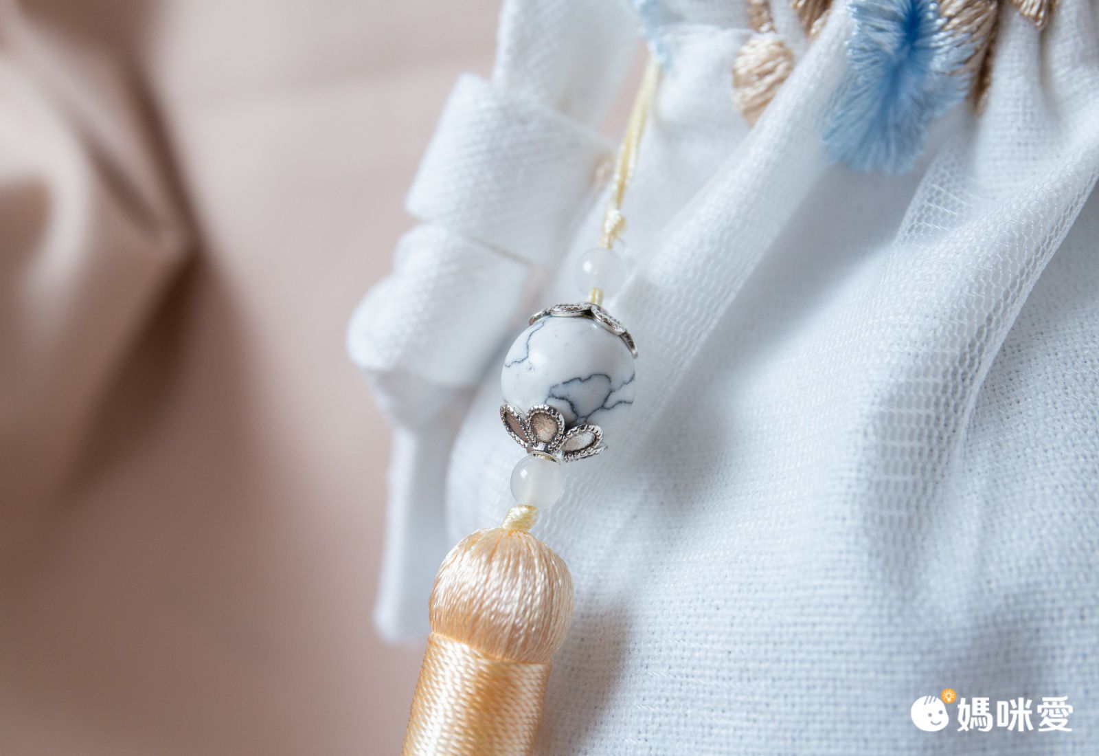 這款精緻的花紋跟垂墜的繩結裝飾,讓人聯想到平安符跟御守的感覺,飽含著希望寶貝能平安快樂長大的心意