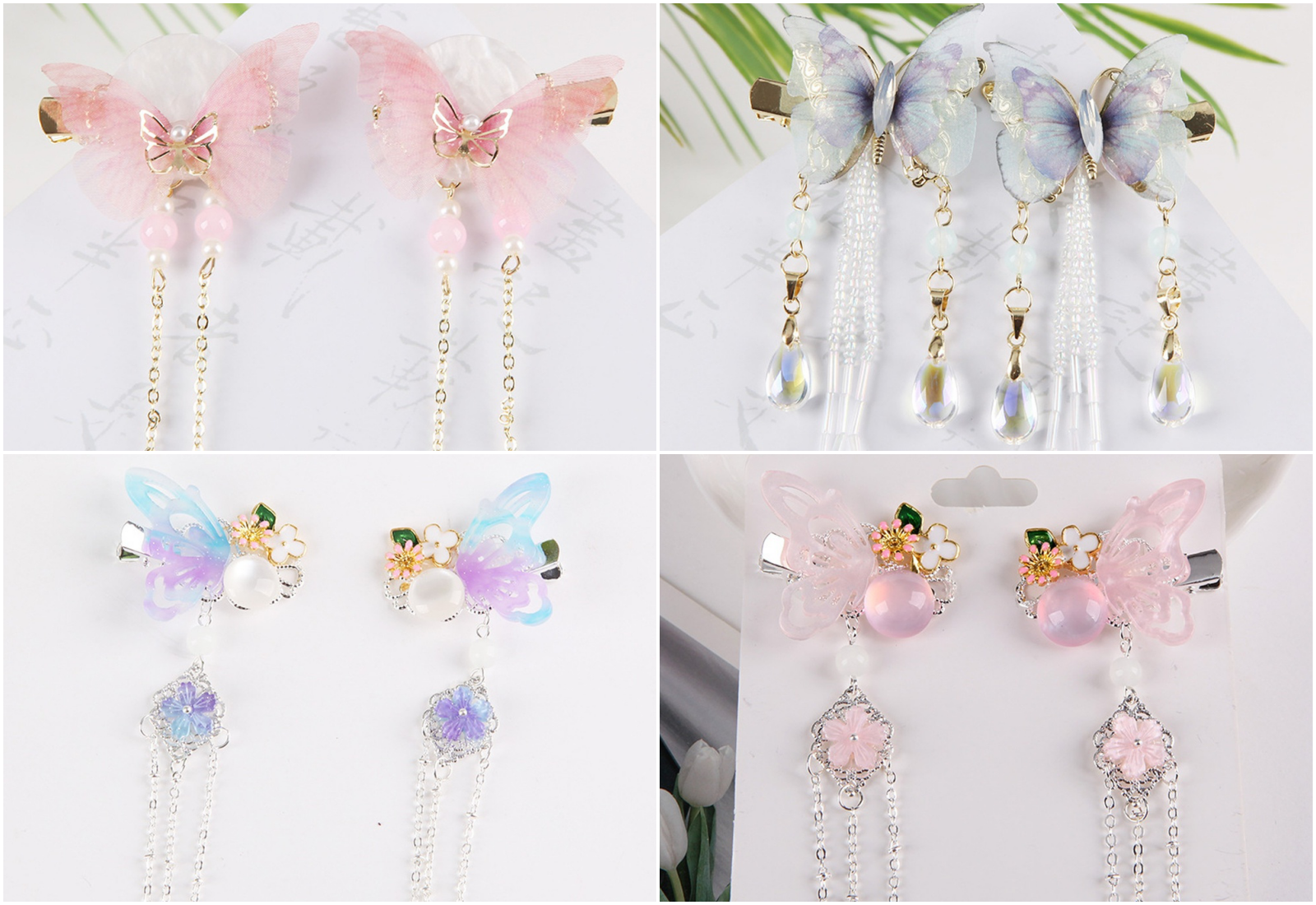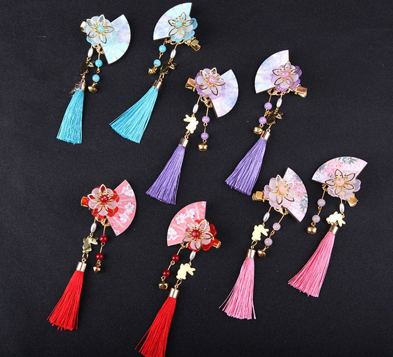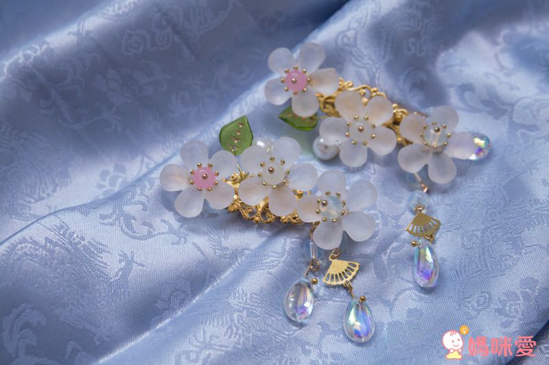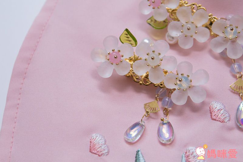 這款太有層次感了,花朵、扇子、流蘇垂墜,結合多樣元素,四色都各有魅力,讓寶貝跟表姊妹們一起戴也是不錯的選擇喔~