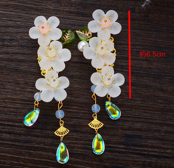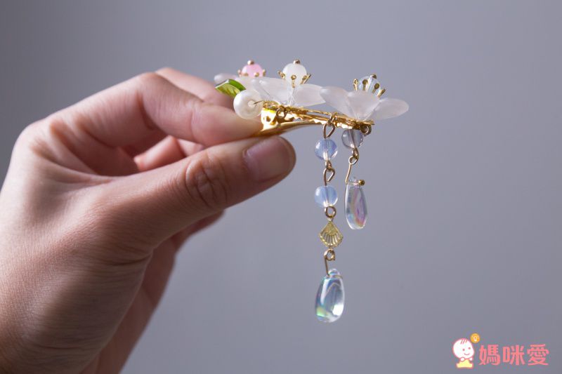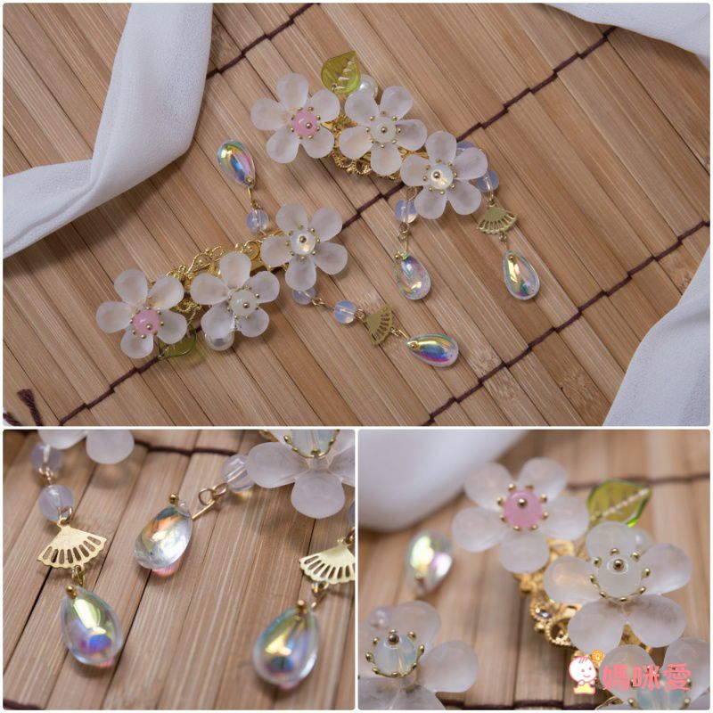 超美的霧面透明花朵鑲上亮金色的髮夾,配上搖墜的幻彩琉璃,隨著一顰一笑輕輕搖曳,如夢似幻,彷彿真的置身兩千年前的古都