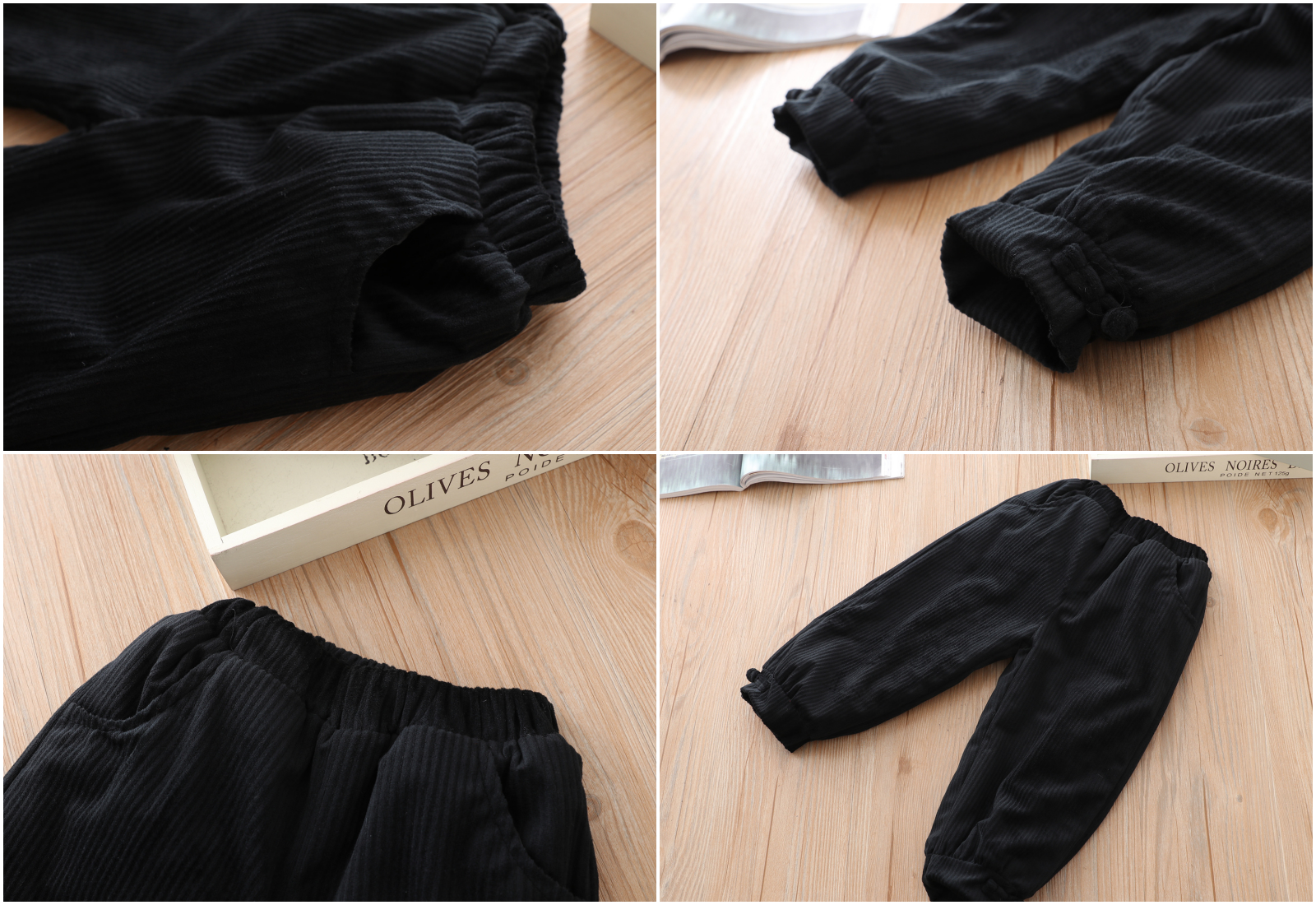 還有黑色百搭燈芯絨長褲,鬆緊帶設計穿脫都方便