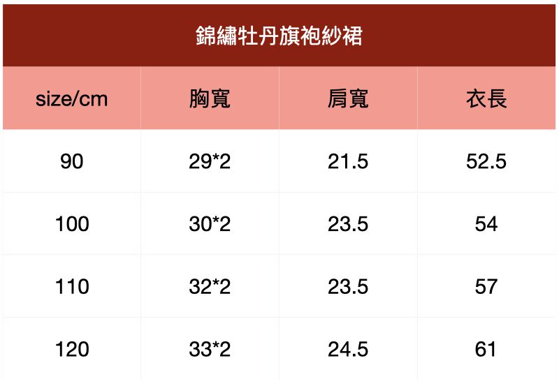 附上尺寸表給媽咪們參考~錦繡牡丹旗袍紗裙