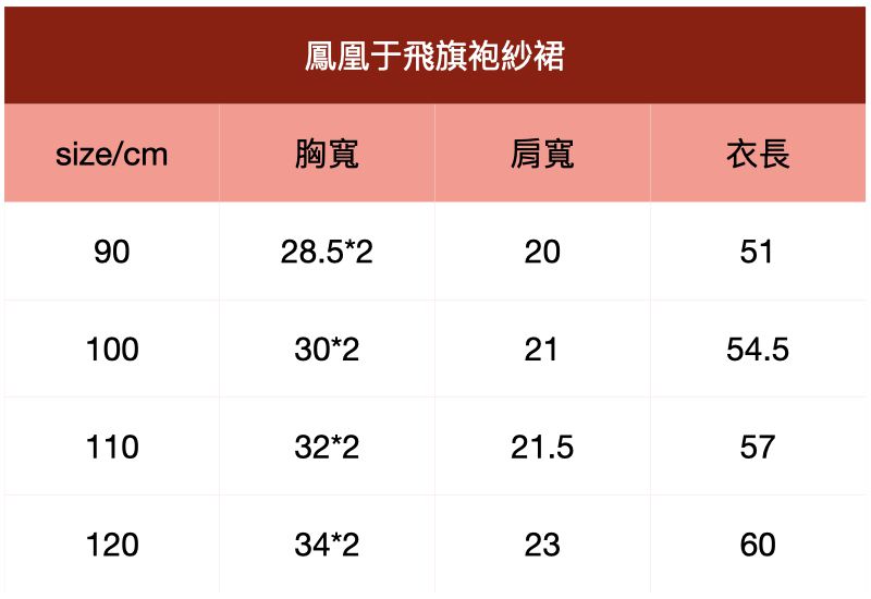 附上尺寸表給媽咪們參考~鳳凰于飛旗袍紗裙