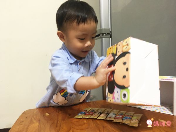 花生米一拿到盒子就被吸引,聽到一天可以吃一包時就很開心,趕緊來數數有哪些他認識的角色呢!