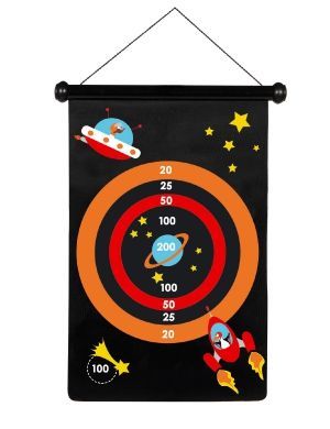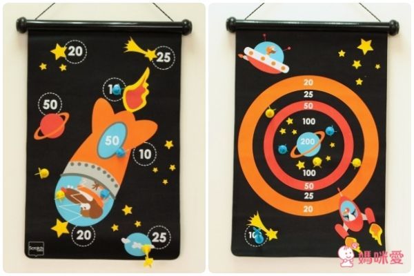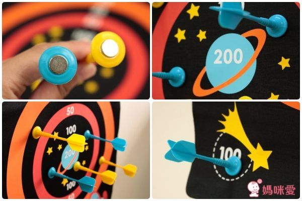 更重要的是他有雙面設計,一面是傳統式的多圈圓型靶,另一面是外太空圖案,射到星星跟星球是不一樣的得分喔,更增添不同的趣味。