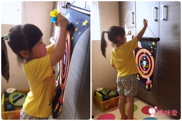 媽媽選擇衣櫃的把手,一秒就完成了兒童飛鏢場啦。smile在 嘗試幾次之後就越來越遠發射飛鏢,弟弟 star 因為還小,所以站比較很近囉~兩隻玩飛鏢的專注眼神實在很可愛啊,媽媽很想在旁邊自備啤酒一杯,想像自己在美式酒吧啊∼哈哈。