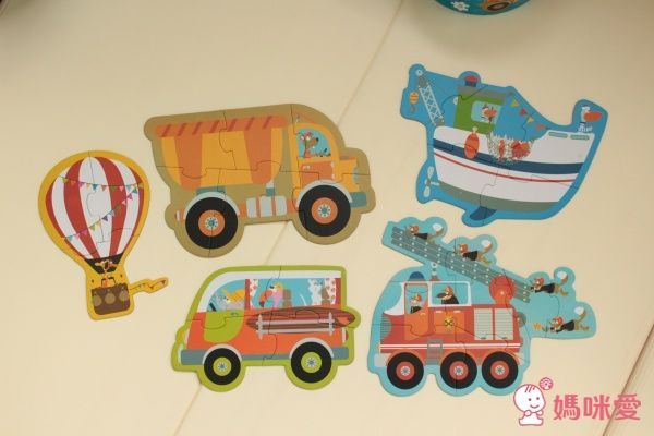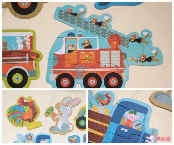 他的圖案不像一般市面上看到的,只有單純車子、水果等,設計上比較活潑、有故事性的感覺,例如這台消防車拼圖,看起來很像奔馳得很快、大家趕著救火一樣吧!(老鼠們都飛起來了~)S 媽覺得這一點還滿特別的!