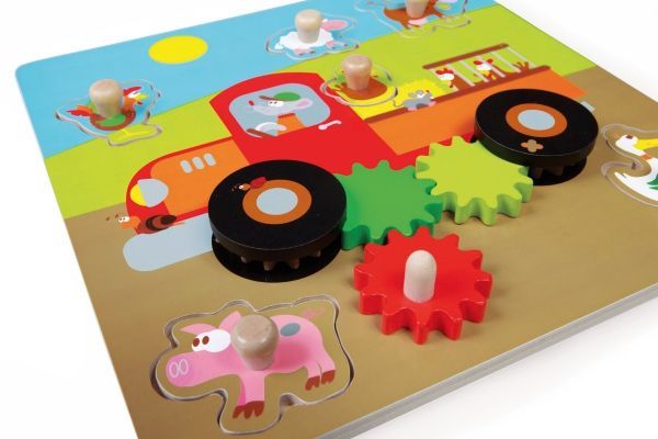 拼好後,寶寶可以試試看轉動最旁邊,有握把的紅色齒輪,整台農場貨車的輪子都會跟著轉動喔!齒輪設計讓木製拼圖變得更立體、更生動啦~