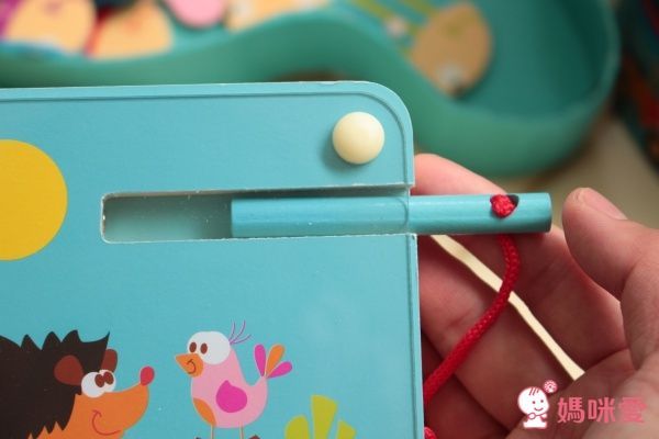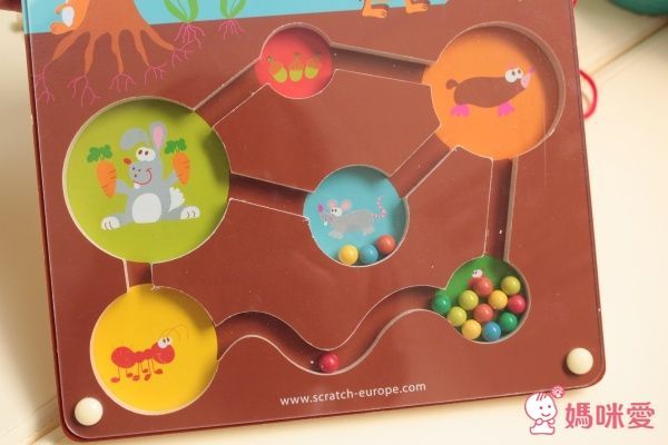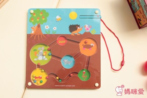 這款磁性迷宮共有 5 種不通顏色小球,小朋友要分別把球球移動到屬於他們的窩裡,一種動物代表的就是一種顏色!磁性運筆迷宮可以幫助寶寶左、右手肌肉發展,最重要的是,在運送小球球的過程中,還能幫助培養孩子耐心和專注力,我覺得是款很簡單,但又能多方訓練的玩具~