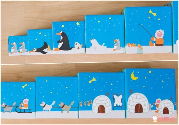 轉個方向~把方塊拼圖平鋪在地上,可以呈現不同的風貌~這一面是極地圖案,企鵝、海報、雪橇犬,還有愛斯基摩人(正在挖洞釣魚呢~)都是在雪地裡才會看到的!