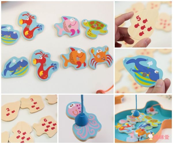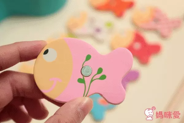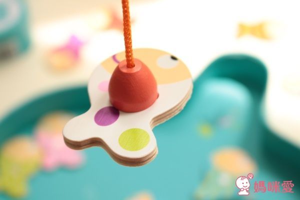 小魚是木頭材質做的,有厚度的設計寶寶小手也很好拿,不過這款要挑戰用魚竿釣魚,可不能輕易就「出手」啊~