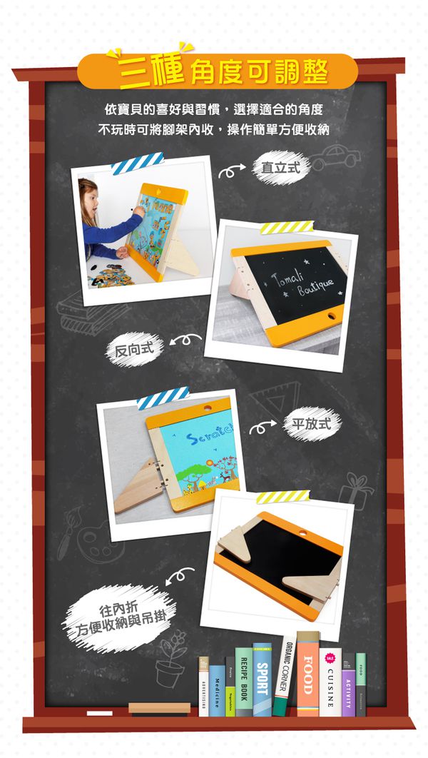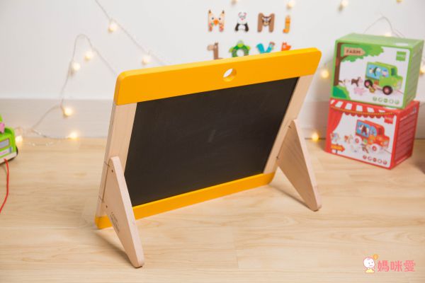 他沒有正反面之分,三腳架可以前後切換,二面都能使用,這樣立起來孩子就不用趴著畫畫了!