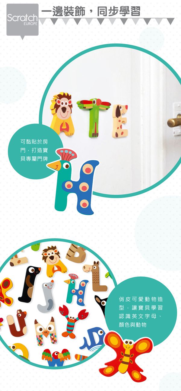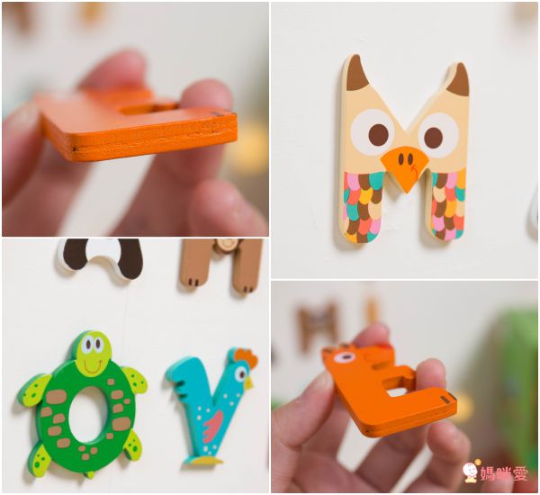 每個英文字母都是一種動物變身而成,他不是磁鐵,所以可以當裝飾、當英文學習小物、辨認顏色與動物、拼單字更自由運用喔!