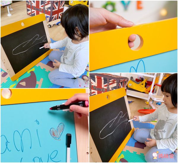 蘋果媽一直很想找個小黑板放兒童房,無奈怕佔空間、又怕粉筆孩子不常用,這次找到比利時 Scratch 雙面畫板,水性彩色筆、白板筆、粉筆都能用,比一般只能用粉筆的黑板划算多啦 ◟(∗ ˊωˋ ∗)◞