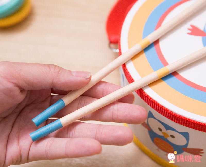 鼓棒握起來相當輕盈,還有貼心的標記持棒的位置(黃色),讓小寶貝輕鬆打出自信的鼓聲!