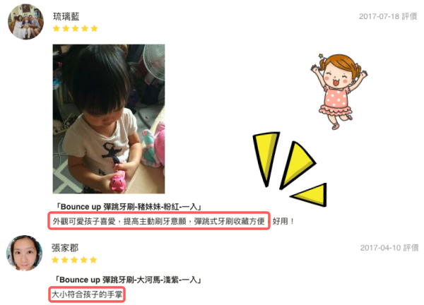而且醫生建議「兒童牙刷最好一個月換一次」,或是多準備幾把替換,以延長使用壽命。尤其準備開學的小寶貝們最需要啦!媽咪快趁這次開團幫小寶貝準備個幾支方便替換(組一個動物園XD),讓他們在家、在學校都能開心刷牙喔~之前買過的媽咪也大讚「提高孩子主動刷牙意願,好用!」、「大小符合孩子手掌」!(๑•̀ω•́)ノ