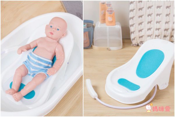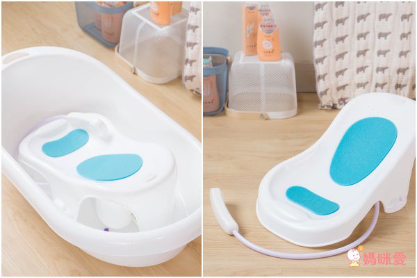 1. 0-12M 支撐座結合澡盆:符合人體工學的支撐座,能保護寶寶的腰椎。上面鋪有藍色的止滑墊,可以防止寶寶躺在座椅時往下滑。