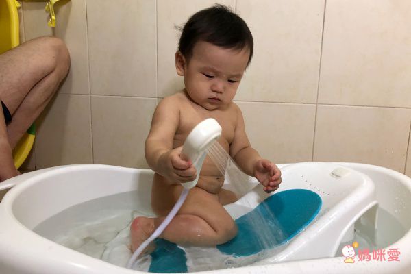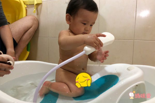 2.蓮蓬頭噴水:一般大人用的蓮蓬頭水壓太強,力道不適合初生寶寶。天鵝澡盆的蓮蓬頭水壓溫和適中,等寶寶大一點後,也可以自己拿著呢:)