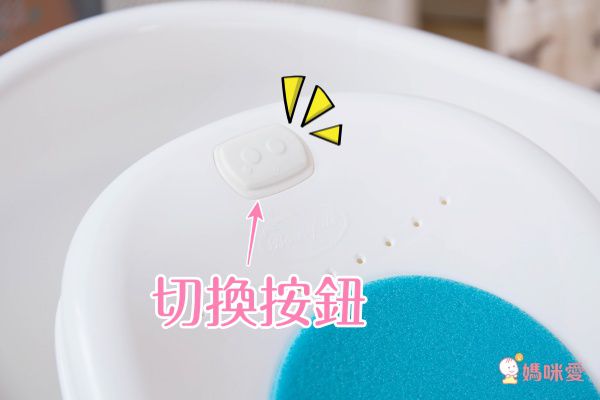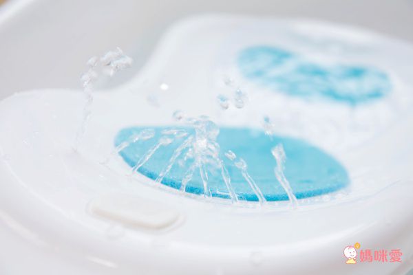 再來試試座椅噴水模式,從座椅上的孔洞會噴出幾隻小小的水柱,感覺好像在幫寶寶做頭部SPA一樣