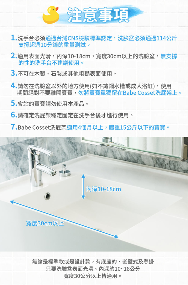 洗屁架通過SGS材料和結構安全檢測,不含雙酚A、塑化劑等有害材質,請媽咪放心。以下還有一些注意事項和洗手台規格說明,請媽咪詳細閱讀後再下單唷!