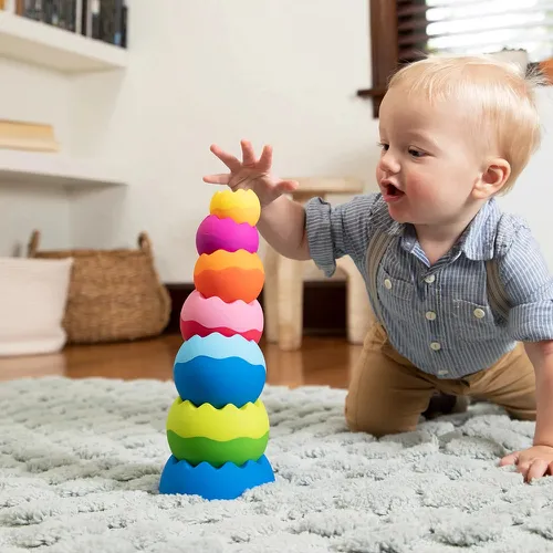 整組玩具包含了點、線與漩渦...等紋路,除了刺激手部肌肉發展,豐富的配色也可以吸引寶寶目光!孩子也在一個套一個的過程中,認識大小順序。培養裡外空間概念