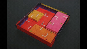 把建築牌圍城棋盤狀,內附一個吊具棋子,輪流前進,讓孩子練習獨立思考,怎麼組合直列&橫列才能達成目標!