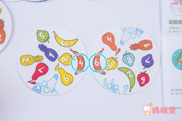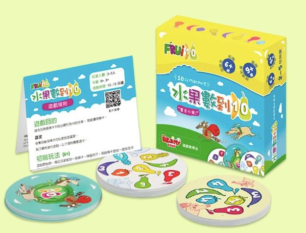 水果數到 10 是利用水果的顏色種類來完成遊戲,運用尋找不同水果提升專注力,每回合尋找與「中央牌的水果或顏色」加起來一旦等於 10 就要大聲喊出來並得分!