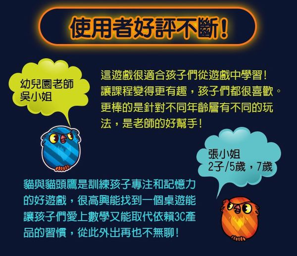 卡牌為貓與貓頭鷹的圖案,除了顏色不同,身上的條紋、斑點也不同,要仔細看清楚,才不會掉進陷阱裡唷~
