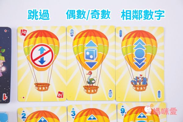 熱氣球上也有特殊規則,例如:跳過、只能出偶數或奇數牌(另有骰子 1 代表只能出奇數喔)、相鄰數字牌等。
