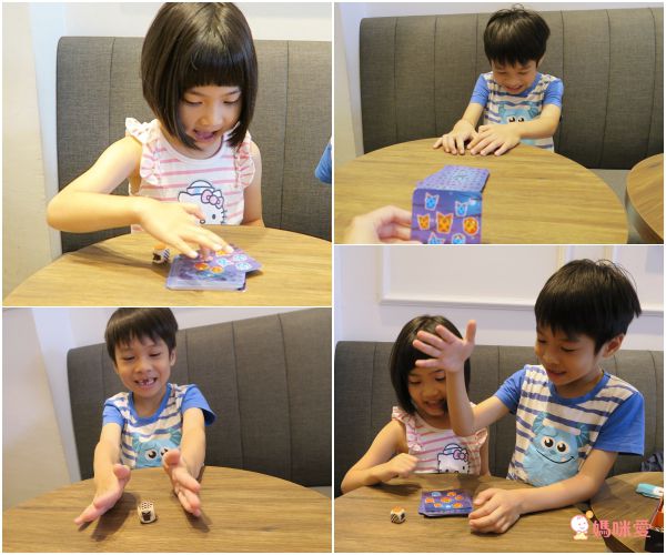 一向很喜歡玩記憶牌的 Eric 迫不及待的想玩,比起一般的記憶牌,我更推薦貓與貓頭鷹!畢竟只有記憶卡是不夠的,能再結合算術、觀察更能讓思考靈活些。搭配孩子最喜歡的擲骰子,兩個孩子都很捧場~玩了好久呢!