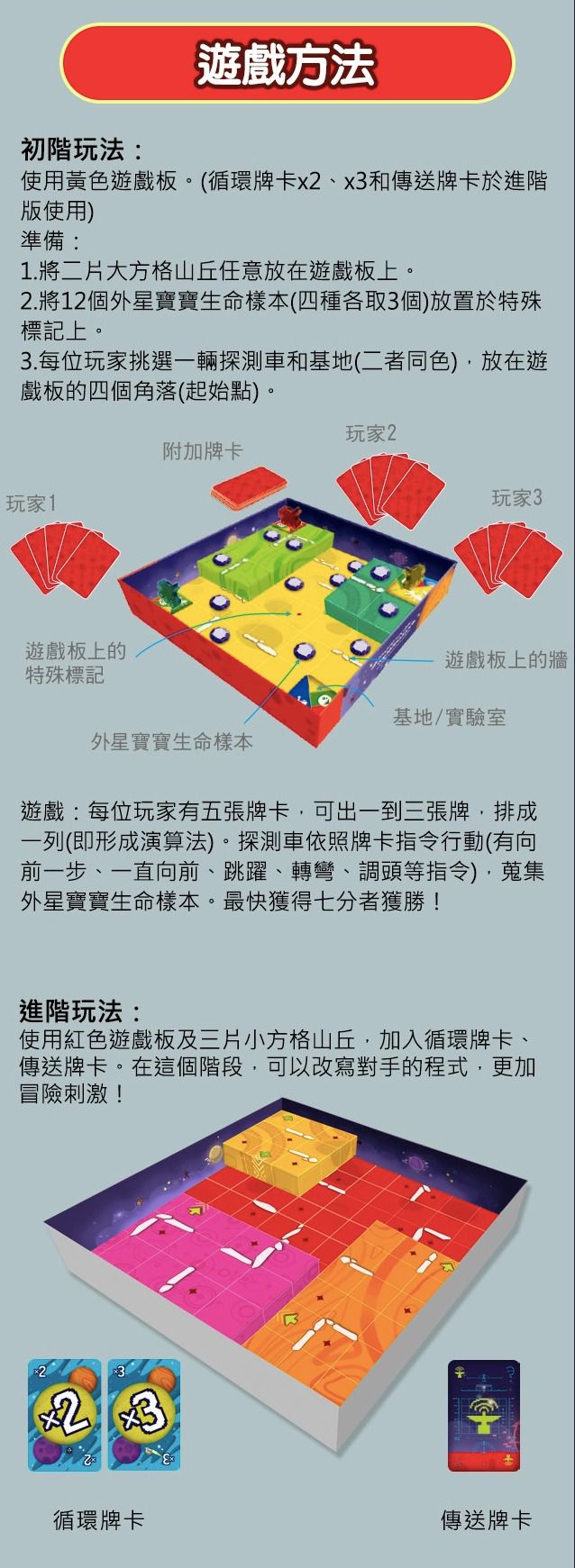 [內 容 物] 1片雙面遊戲板、5個硬紙板山丘、52張命令牌卡、4個探測車模型、