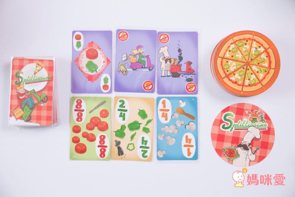 披薩家的難度我覺得算比較高的,適合大一點的孩童。雖然比較難一點,但我很推薦,因為市面上很少針對 “分數” 設計的桌遊啊~分數到底是什麼呢?生活中會用到分數嗎?利用圓形 Pizza 教孩子分數概念,孩子更好理解。