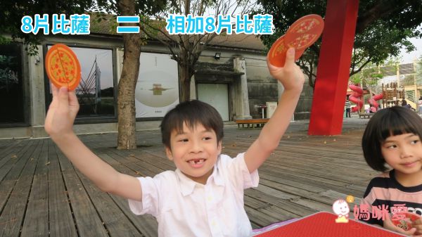 對於低年級的 Eric 我先請他們將卡牌放在正中間,每人拿四張披薩卡,桌面上也留著四張。先忽略口味,只要數量與 “中央披薩牌數量相等” 就能以湊成一組收起來(不過不能只取單張,一定要加總,這樣才有練習到啊~)