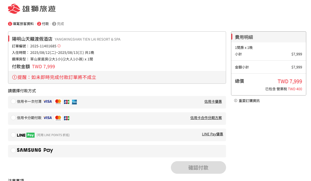 4. 可選擇下列幾種付款方式,付款後即完成訂房!