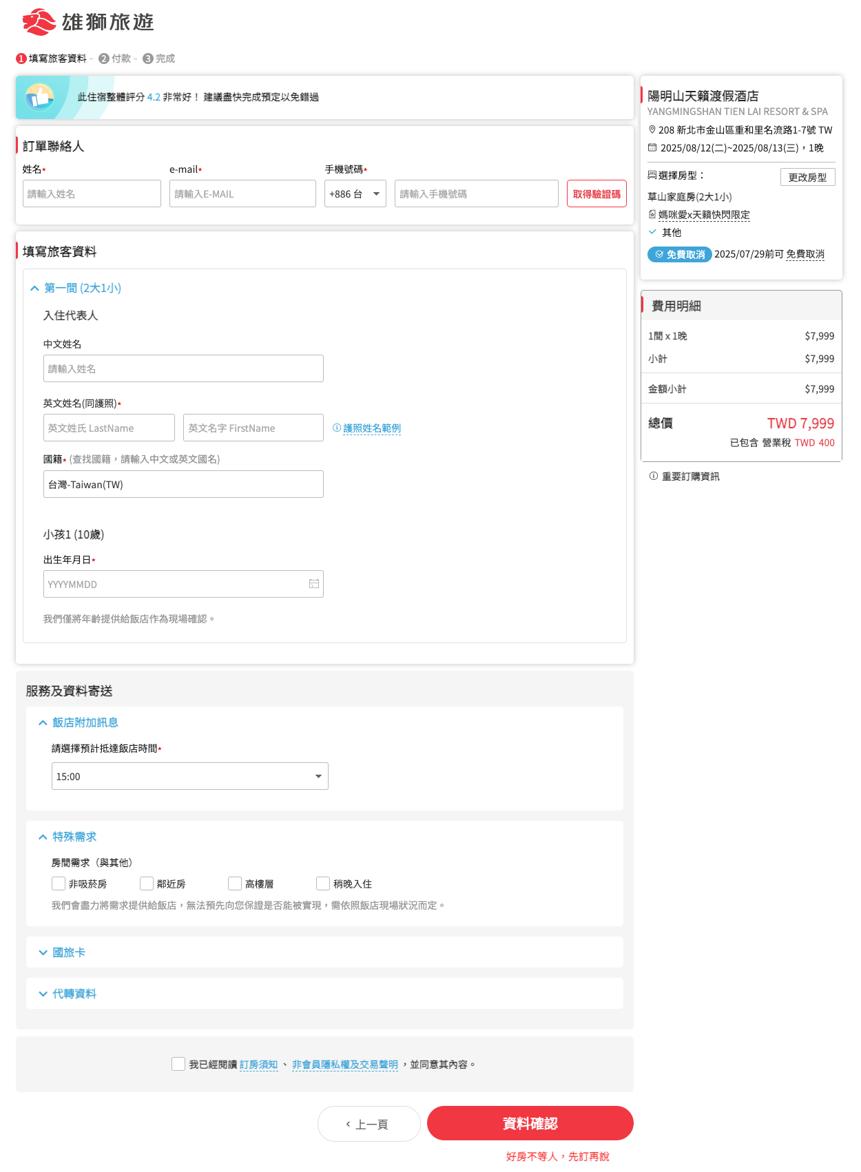 3. 填寫旅客資料、小孩出生日期(現場飯店可能會須核對健保卡資料)與相關特殊需求、是否使用國旅卡後,即可進行付款~
