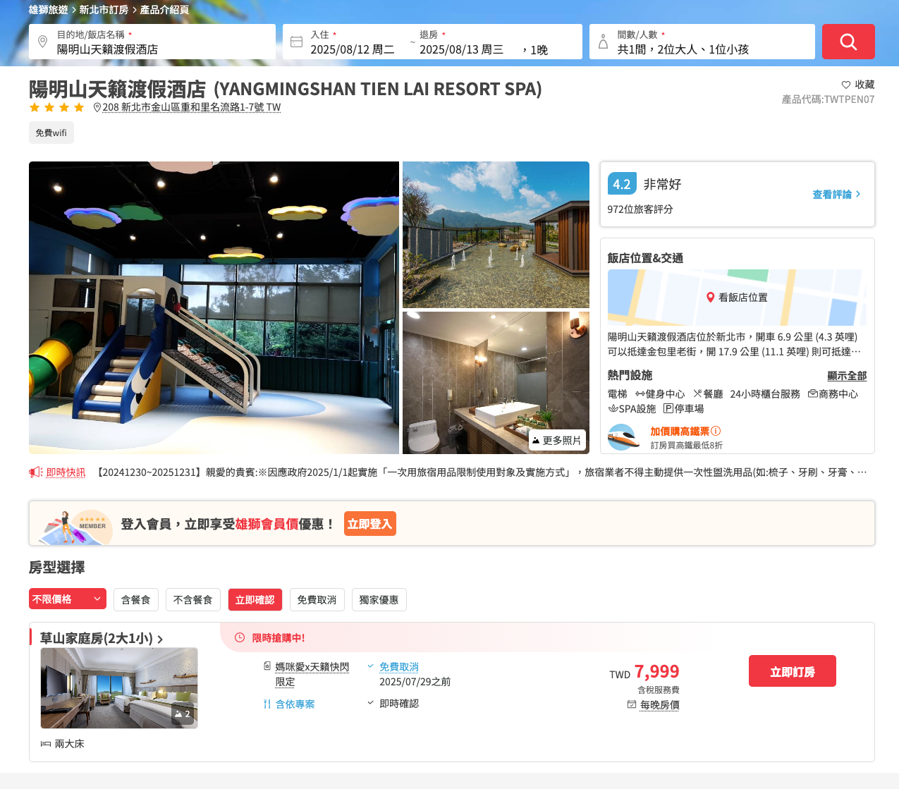 2. 選擇入住日期、人數後,點選查詢,如果下方沒有出現「立即訂房」則表示該日已無房間,請媽咪再試試其它日期即可喔!